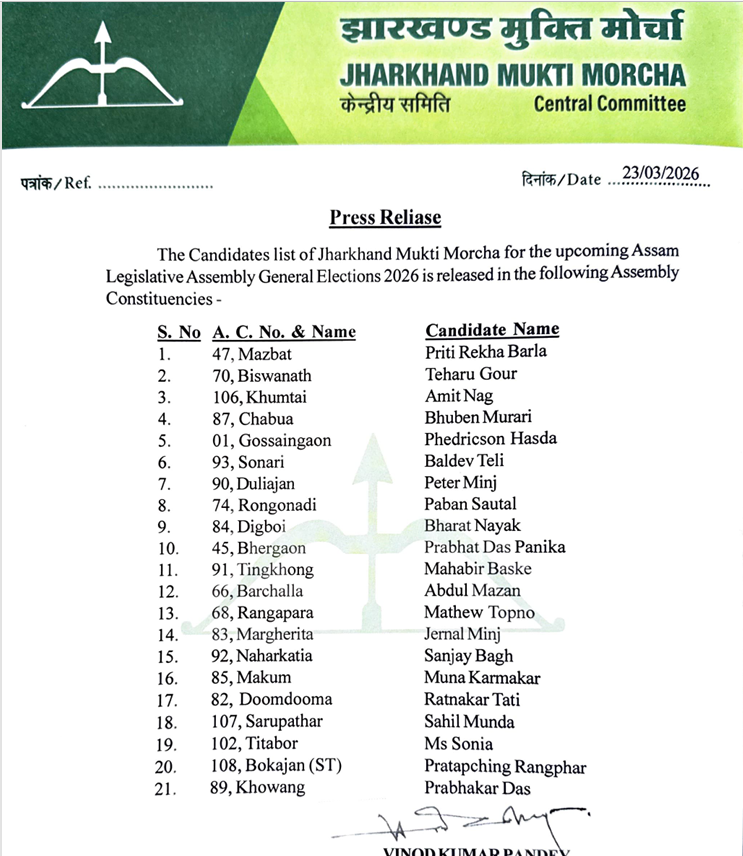 असम में चुनाव लड़ने के लिए जेएमएम को उसका तीर-धनुष सिंबल प्राप्त हुआ है. पार्टी ने चुनाव प्रचार के लिए बीस लोगों का नाम भी चुनाव आयोग को भेजा है.