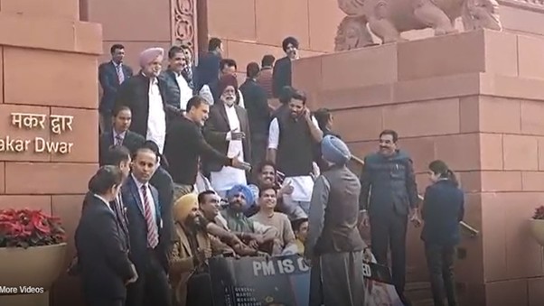दरअसल, कांग्रेस नेता राहुल गांधी कांग्रेस सहित अन्य सांसदों के साथ मकर द्वारा की सीढ़ियों पर नारेबाजी कर रहे थे.