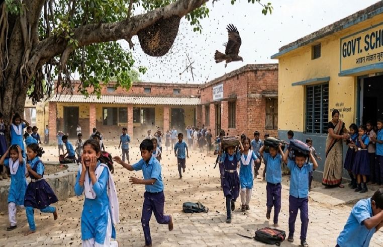गुरुवार की सुबह एक चील पेड़ के पास पहुंचा, जिससे मधुमक्खियां अचानक आक्रामक हो गईं. चील तो वहां से उड़ गया, लेकिन भड़की हुई मधुमक्खियों ने स्कूल में मौजूद बच्चों पर हमला कर दिया.