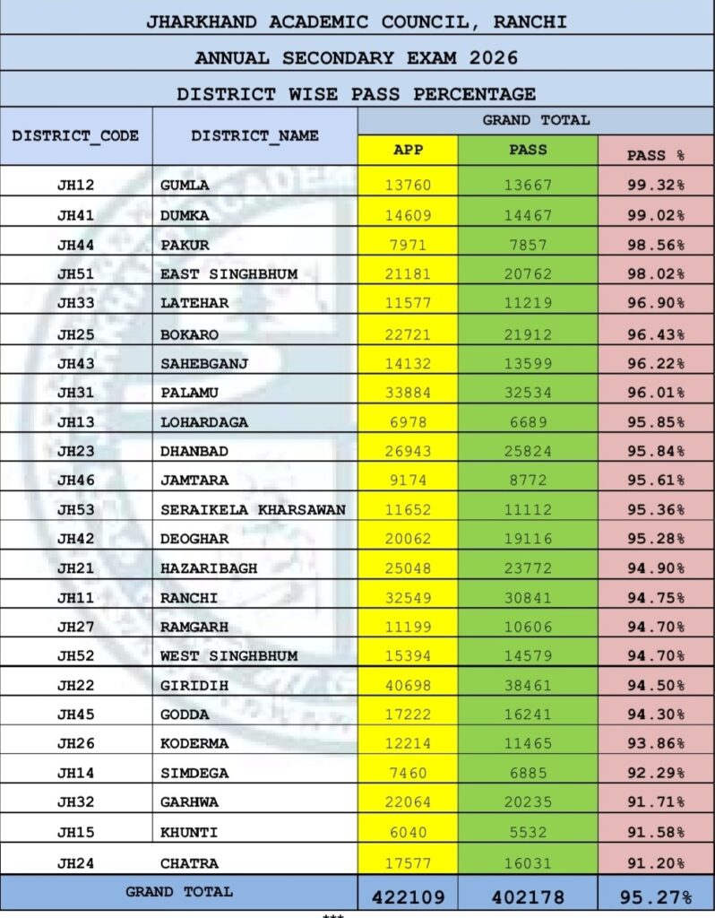 रांचीः झारखंड एकेडमिक काउंसिल (JAC) ने वार्षिक माध्यमिक परीक्षा 2026 का परिणाम घोषित कर दिया है. इस वर्ष कुल 95.27 प्रतिशत प्रतिशत विद्यार्थी सफल रहे हैं.
