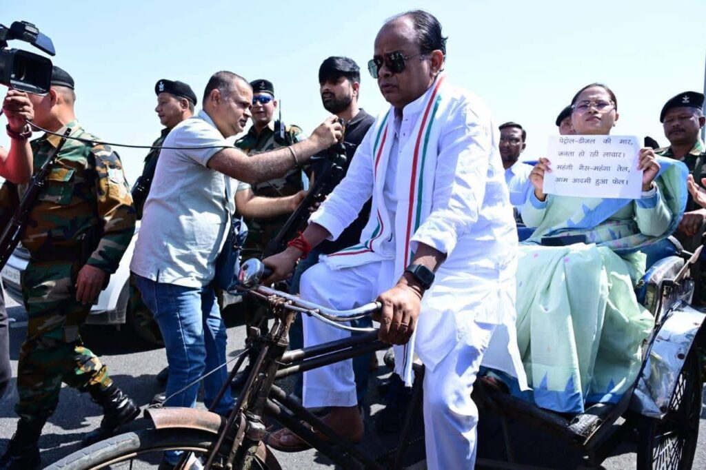 रांचीः बजट सत्र के 13वें दिन शुक्रवार को झारखंड सरकार के स्वास्थ्य मंत्री इरफान अंसारी रिक्शा चलाते हुए विधानसभा पहुंचे. उनके रिक्शे पर सवारी के तौर पर कृषि मंत्री शिल्पी नेहा तिर्की रिक्शा पर बैठी थीं. कांग्रेस नेताओं के निशाने पर केंद्र सरकार थी. वे महंगाई और रसोई गैस की किल्लत पर ध्यान खींचने के लिए हाथों में तख्ती लिए थे.
